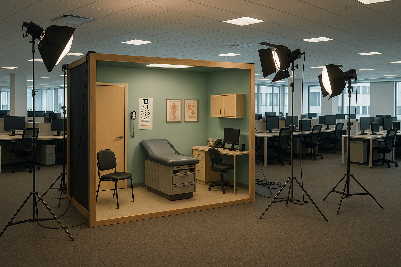 Our intention is not for the set to feel illusionistic but rather theater-inspired. It's a backdrop that makes the viewer feel like they are behind the scenes in a clean and intentional approach. The set will be optimized to accommodate two individuals—a WellSky Team member and a healthcare professional.